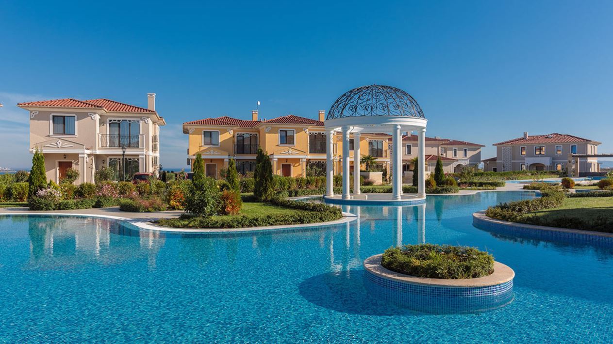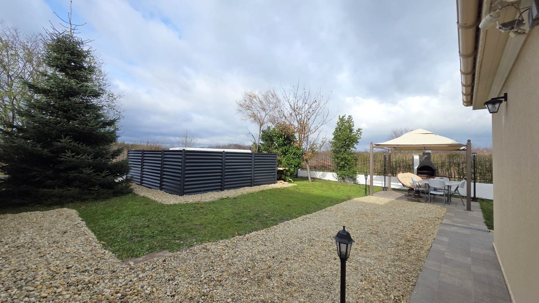 Особено привлекателна характеристика на имота е панорамната гледка, която може да се наслаждавате както от вътрешността на къщата, така и от външните пространства. Всяка къща в комплекса разполага с самостоятелно дворно пространство, което осигурява лично уединение и възможност за разнообразни активности на открито. Общите площи на комплекса включват обширна зона за отдих с басейн, беседка, фонтан, алеи за разходка и богато озеленени площи, създаващи усещане за хармония, спокойствие и луксозен начин на живот.