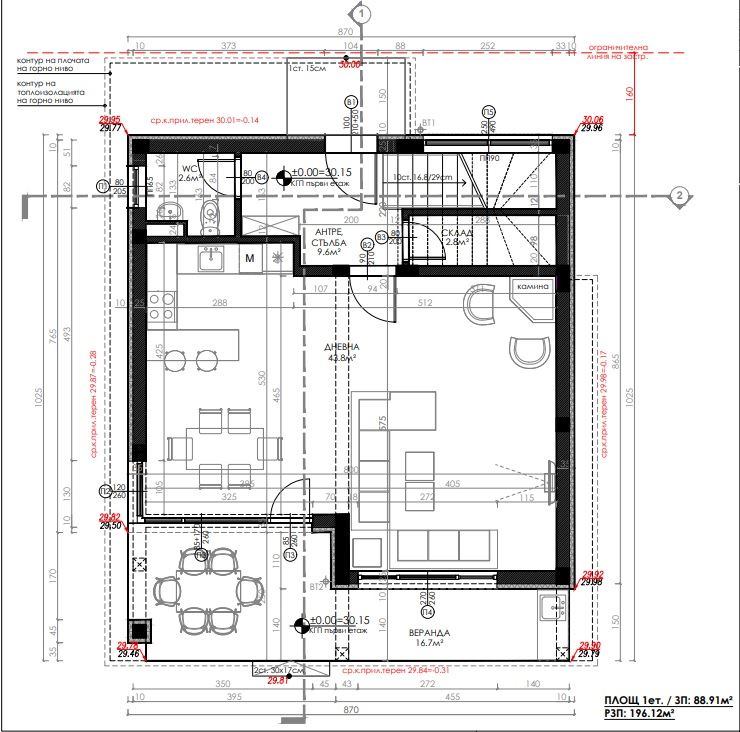 - Първо ниво: входно антре с удобна гардеробна, отделна тоалетна, склад под стълбите, просторна дневна с място за кухня и трапезария и директен излаз към 30 м2 веранда и озеленения двор.