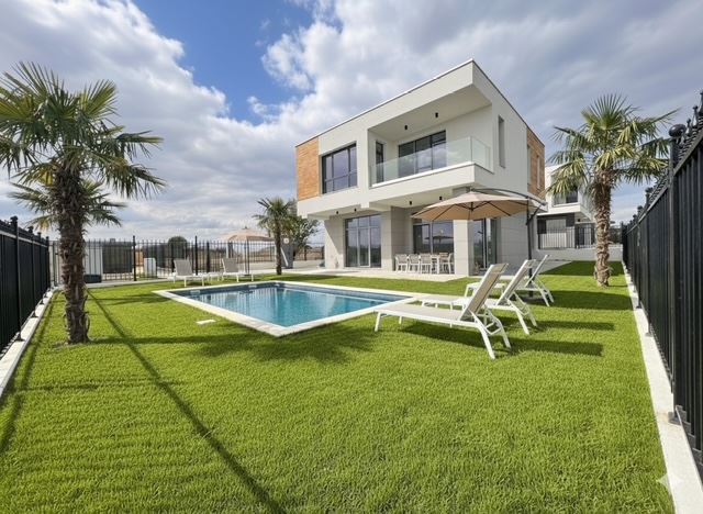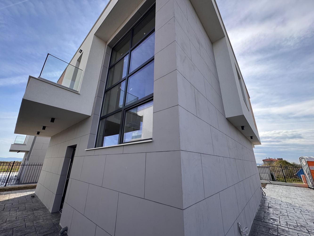 Къщата е с обща площ 196 м2, на два етажа, с премислени обеми и естествена светлина. От дневната се излиза към голяма веранда от 30 м2, идеална за релакс, семейни събирания и летни вечери на открито. Имотът разполага и с две тераси с фронтална или частична гледка към морето, които допълват усещането за свобода и простор.