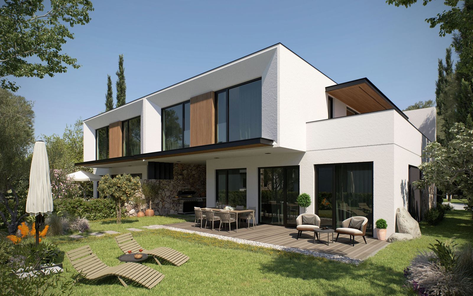 - Издаване по БДС (Български Държавни Стандарти): завършена конструкция и покрив, фасада с положена топлоизолация и монтирана дограма; вътрешно – изградени Ел. и ВиК инсталации до тапа/точка, положени мазилки и замазки. Вертикалната планировка около къщата е изпълнена. Този етап позволява да реализирате индивидуален интериор и материали по ваш избор.